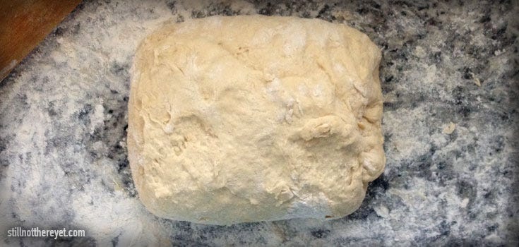 2. KNEAD THE DOUGH: Place the dough onto a floured work surface and shape into a cohesive dough ball before rolling into a rectangle roughly 9 by 13 inches. Next, start a process where you fold the dough into thirds along the long side (like folding a letter), then turn and fold into third again (this time along the other side). After the dough is all folded up, flip it over and roll it out into the 9 by 13 inch rectangle again. Repeat this process of folding and rolling a total of three times. Finally, cut the dough in half, wrap each piece tightly in plastic wrap, and place in the fridge overnight.